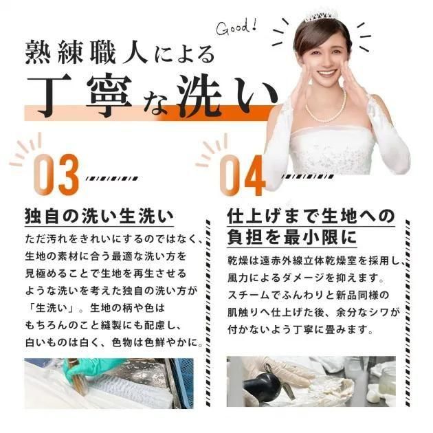 繊細なウェディングドレスやカラードレスも安心してお任せいただける丁寧な仕上がりと信頼の技術で、お客様の満足を追求しています。満足度85%という実績が、選ばれる理由のひとつです。大切な衣装を安心して預けられるファインのサービスを、ぜひわたしたちにお任せ下さい。