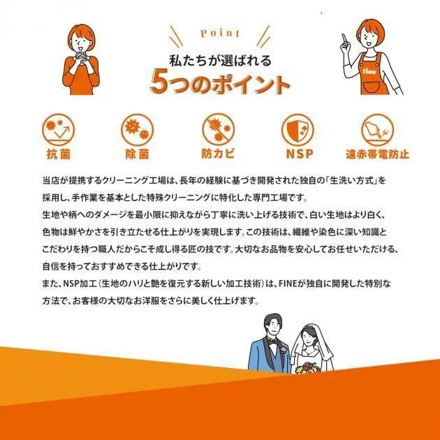 繊細なウェディングドレスやカラードレスも安心してお任せいただける丁寧な仕上がりと信頼の技術で、お客様の満足を追求しています。満足度85%という実績が、選ばれる理由のひとつです。大切な衣装を安心して預けられるファインのサービスを、ぜひわたしたちにお任せ下さい。